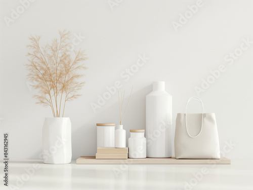 Minimalistic home decor scene with white vases, beige accents, and a small white goodie bag on a wooden shelf against a white background.