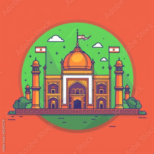 delhi, saffron, white, green, modern architecture, vibrant, city landscape, symbolic, graphic, contemporary, stylised, urban, india, architecture, building, mosque, travel, illustration, taj, taj mahal, mahal, asia, city, church, historical building, icon, silhouette, landmark, religion, agra, design, dome, tower, temple, house, art