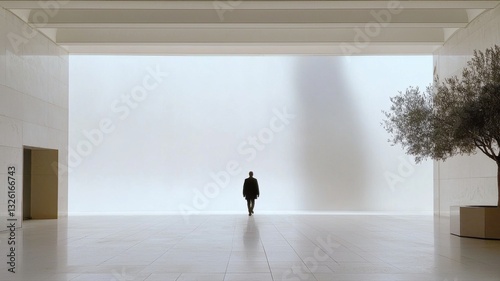 Minimalistic interior with solitary figure in spacious, modern hall featuring tree and white walls.