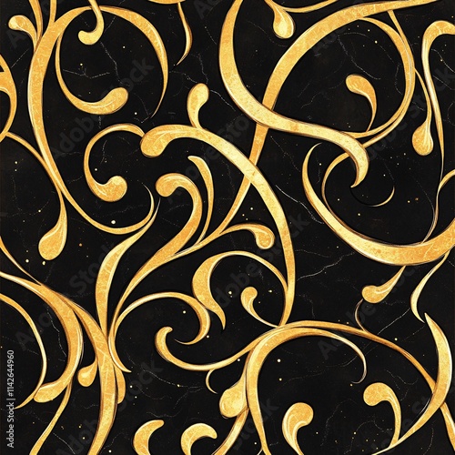 Minimalistic linear ornament in gold and black, featuring intertwining vine patterns and delicate scrolls.Draw ornaments using only lines and 2 colors