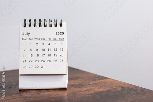 Minimalistic photo of a desk calendar showing July 2025. Clean and professional design, perfect for themes related to time management, planning, or organization.