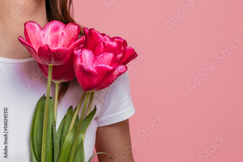 Minimalistic postcard March 8. Girl holding pink tulips on a pink background