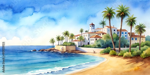 Minimalistic Spanish Riviera Watercolor Illustration AI Generative