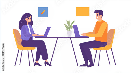 Minimalistic vector illustration of two professionals working at a shared table with laptops and decorative elements, symbolizing teamwork and collaboration in a modern office environment