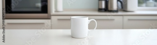 Minimalistic White Coffee Mug on Clean Kitchen Counter with Modern Appliances in Bright and Spacious Interior Setting