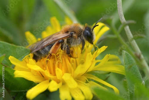 arthropoda, bee, ecology, hymenoptera, insect, nature, animal, biodiversity, biology, closeup, entomology, female, invertebrate, macro, mining, outdoors, pollinator, single, solitary, wild, wildlife, pollen, blowball, yellow, flower, garden, spring, summer, wing, flora, plant, bloom, blossom, growth, environment, meadow, sunny, field, leaf, green, detail, collecting, feeding, floral