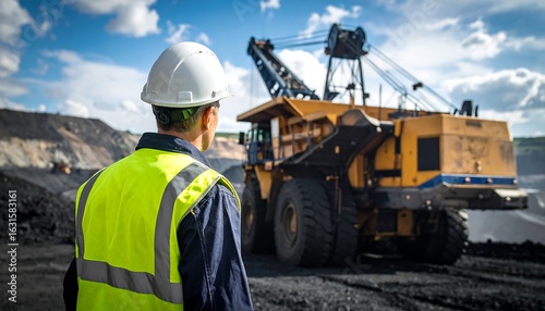 Mining Engineer Inspects Heavy Machinery at Coal Mine with Dramatic Landscape View.
