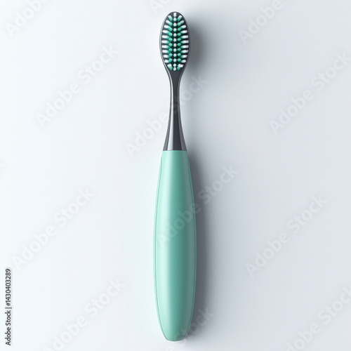 Mint green toothbrush with charcoal-infused bristles on a clean white surface...