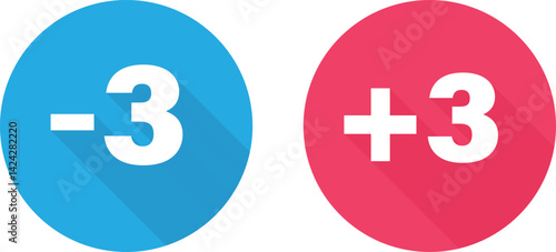 Minus 3 and Plus 3 Circular Icons Displaying in Red and Blue with Long Shadow.