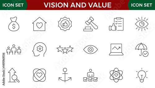 Mission, vision and value icon set. Outline illustration of icons. Core values line icons.