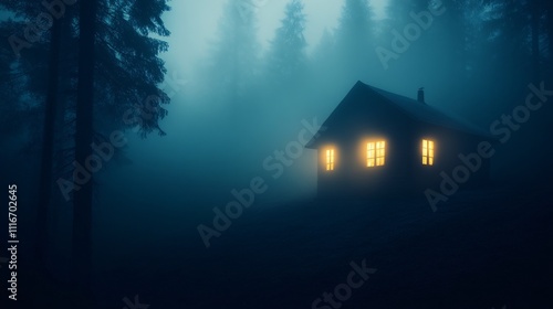 cabin, house, mist, fog, forest, tree, dark, atmosphere, wilderness, warm light, isolation, night time, scenic, tranquil, serene, rural, solitude, mystery, nature, landscape, winter, eerie, peaceful, lonely, quiet, adventure, retreat, escape