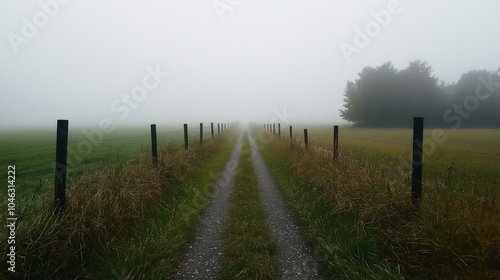 mist, fog, countryside, landscape, pathway, dirt road, rural, green, nature, tree, grass, serene, tranquil, distant, fence, field, scenery, horizon, escape, peaceful, solitude, travel, adventure, calm, winter, autumn, morning, cloudy, atmospheric, quiet, scenic, view, journey, unexplored, exploration, hue, light, distance, simplicity, connection, environment, freshness, beauty