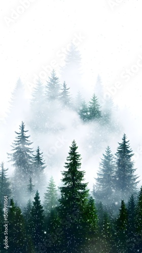 Misty evergreen forest scene, snow falling softly on coniferous trees shrouded in fog, a serene winter landscape