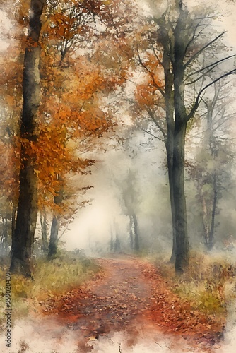 path, forest, tree, leaf, autumn, fall, foliage, misty, fog, timberland, nature, landscape, scenery, season, brown, yellow, orange, green, light, sun, soft, peaceful, serene, tranquil, dreamy, magical, whimsical, moody, atmospheric, art, watercolor, painting, abstract, texture