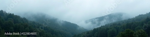 Misty grey fog rolls in over a forest landscape, misty, terrain, overcast