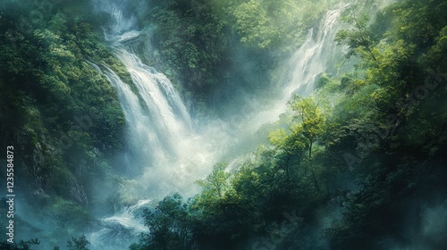 Misty jungle waterfall cascades, lush greenery background; nature scene