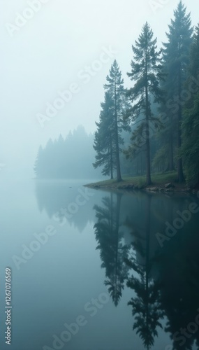 Misty lake surface reflects towering trees with silvery gray hues, mist, clouds