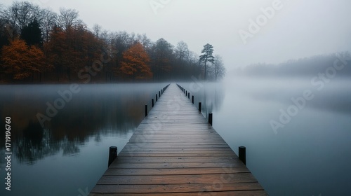 lake, pier, water, wood, boardwalk, autumn, season, calmness, silence, peace, calm, environment, background, mist, fog, forest, landscape, nature, fall, weather, wooden, board, pathway, journey, destination, river, tree, scenic, nobody, atmosphere, outdoors