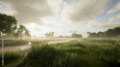 fog, mist, wetland, meadow, landscape, grass, tree, water, nature, tranquil, morning, sunlight, river, reed, plant, scenery, green, sky, cloud, calm, peaceful, atmosphere, outdoors, environment, rural, foggy, overcast, daylight, hazy, light, serene, lush, vegetation, pasture, scenic, countryside, idylli, fairy tale, dreamy, soft, mystical, eerie, gloomy, moody