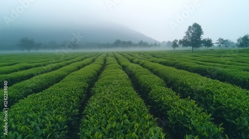 tea, plantation, row, bush, green, leaf, misty, morning, fog, hill, landscape, agriculture, farming, nature, scenic, view, rural, field, plant, growth, fresh, organic, serenity, calm, peaceful, calmness, environment, ecosystem, botany, horticulture, cultivation, harvest, crop, dirtied, earth, sun, light, sky, tree, mist, haze, summer, spring, autumn