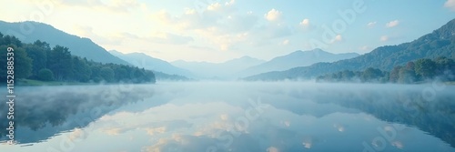 Misty morning with soft light blue clouds drifting across a serene lake, lake, peaceful