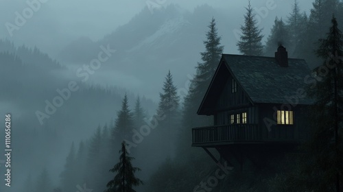Misty mountain cabin at twilight.