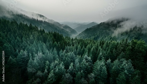 forest, mountain, mist, fog, tree, evergreen, aerial view, nature, landscape, serene, green, moody, lush, coniferous, mountainous