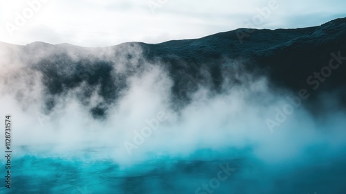 mountain, lake, fog, mist, water, steam, sky, cloud, nature, landscape, scenic, view, travel, photo, adventure, serenity, calm, peaceful, tranquil, atmosphere, environment, blue, teal, water, green, grey, white, dark, shadow, light, hill, vapour, mystic, dreamy, magical, wonder, awe, image, picture, photo, cloud, storm, sea, ocean, wave, mountain, smoke, rock