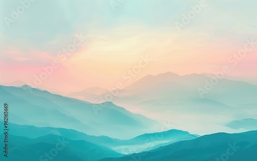 mountain, range, landscape, sky, sunrise, mist, fog, horizon, hill, peak, dawn, cloud, nature, view, outdoors, scenic, aerial, blue, green, pastel, soft, tranquil, peaceful, calm, serene, dreamy, beautiful, majestic, elevated, overcast, hazy, distant, colours, light, gold, warm, photo, photo, art