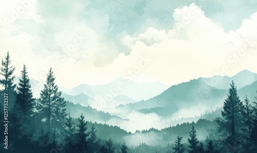 Misty mountain landscape, serene forest view, peaceful nature scene, ideal for calming decor