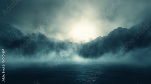 misty, mountain, landscape, fog, heavy, cloud, dramatic, light, scene, view, dark, water, horizon, nature, exterior, atmosphere, silhouette, cold, grey, blue, grayish, toned, sunlit, peak, vale, ambient, dim, shadowy, texture, illumination, mountainous, background, evening, morning, foggy, watery