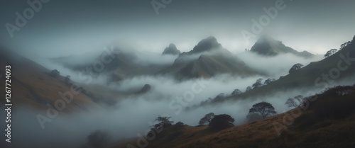 Misty mountain landscape with fog rolling over hills and silhouettes of trees in the foreground at dawn or twilight Copy Space