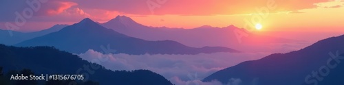 Misty mountain peaks ablaze with sunset hues, soft light , solitude, atmosphere