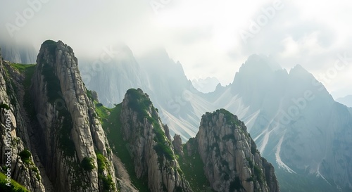 mountain, mist, fog, haze, peak, rocky, landscape, nature, scenic, outdoors, cloudy, weather, summit, range, alpine, high, altitude, beauty, serene, tranquil, atmospheric, vista, overcast, grey, sky, craggy, remote