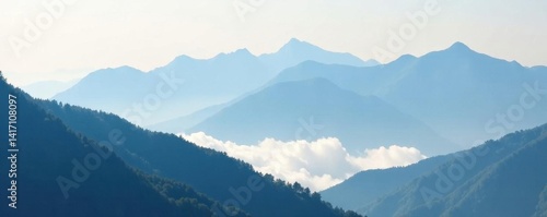 Misty mountain peaks shrouded in white, ethereal fog , dawn, fog, cold