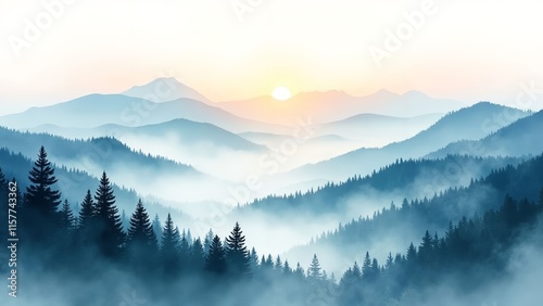 landscape, mountain, sunrise, sunset, fog, misty, tree, forest, pine, conifer, nature, scenery, serene, calm, tranquil, peaceful, blue, sky, light, dawn, dusk, horizon, hill, silhouette, layer, gradient, atmospheric, aethereal, dreamy, majestic, scenic, huge, wilderness, morning, evening, pastel, soft, glowing, sun, mountain, range, wood, terrain, hazy, remote, beauty, quiet, solitude
