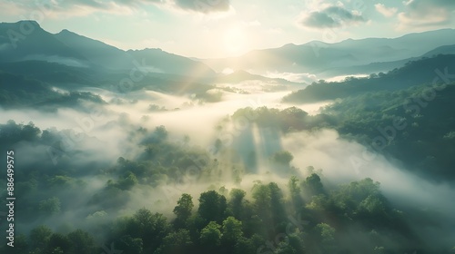 Misty Mountain Valley Sunrise with Serene Landscape and Natural Beauty