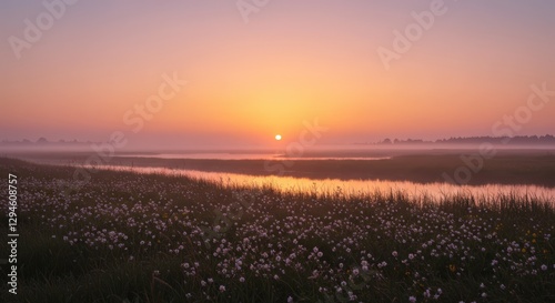 Misty sunrise over peaceful lake in countryside. Tranquil morning landscape with fog rolling over water and hills. Serene nature scene for relaxation, calendar, travel blog