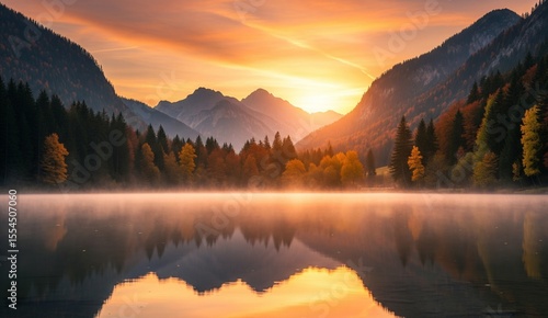 Misty Sunrise over Reflective Lake with Autumn Trees and Mountain Silhouettes