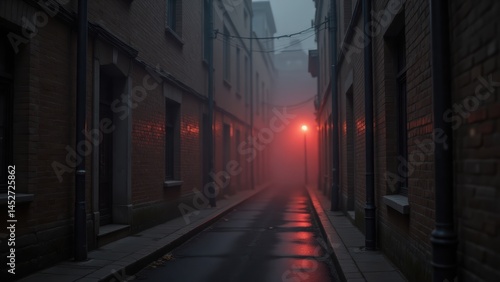 Misty Urban Alleyway at Night with Red Light: Dark, Moody Cityscape