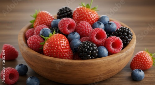 Mixed Berries in Wooden Bowl on Table Strawberries, Blueberries, Raspberries