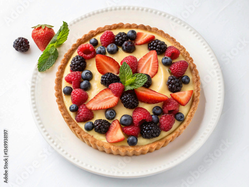 tart, berry, strawberry, strawberry, raspberry, raspberry, blueberry, blueberry, blackberry, blackberry, custard, cream, pastry, dessert, sweet, fresh, epicure, homemade, baked, crust, filling, mint, colourful, assorted, closeup, topview, plate, white background, delicious, summer, elegant, confection, treat, still life, photo