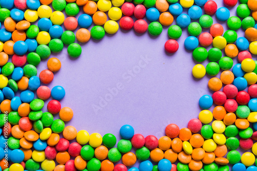 Mixed collection of colorful candy, on colored background. Flat lay, top view. frame of colorful chocolate coated candy