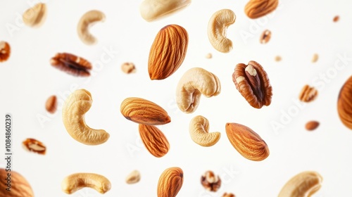 Mixed nuts floating against white background, capturing the variety and color of almonds, cashews, and walnuts