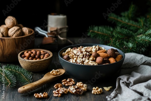 Mixed nuts in a bowl on dark wooden table with holiday decor