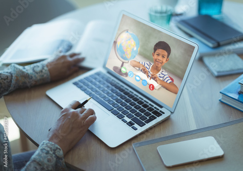 Mixed race schoolboy learning displayed on laptop screen during video call with female teacher