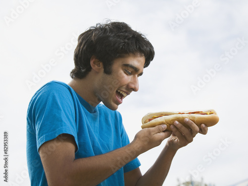 teenage, anticipation, boy, carnival, caucasian, closeup, color image, copy space, day, eating, enjoying, fast food, food and drink, holding, horizontal, hot dog, ravenous, one person, outdoors, people, photo, half face, single object, smiling, snack, standing, state fair, tasty, teenage, treat
