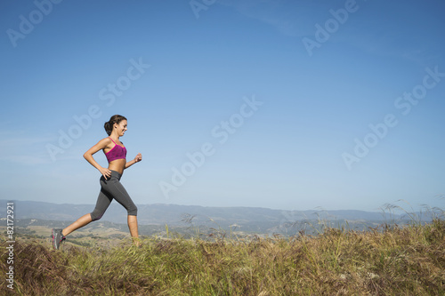 blue skies, brunette, caucasian, clear sky, color image, copy space, day, energy, environment, fit, fitness, freedom, healthy living, horizontal, jogger, lifestyle, long hair, motion, nature, one person, outdoors, people, photo, ponytail, runner, running, half face, activewear, sunny, woman, young adult, missy