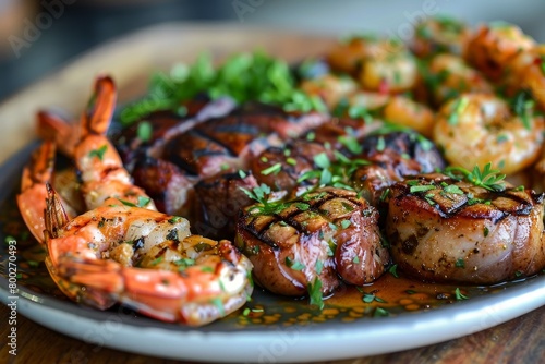 turf, surf, shrimp, steak, seafood, beef, cooked, meat, grill, plate, dinner, food, background, eatery, lemon, eye, tomatoes, meal, epicure, pepper, grilled, potato, prawn, asparagus, rosemary, rib, medium, rare, closeup, juicy, seared