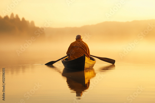 Mönch paddelt ruhig in Boot über spiegelndes Wasser bei Sonnenuntergang
